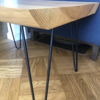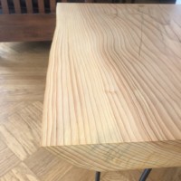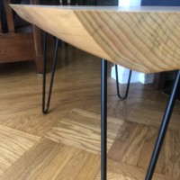This live edge table is made from a beautiful slab of salvaged cedar atop steel hairpin legs. The slab has several unique details which add to its character, including several small cracks in the surface, a reddish band that runs down one side, and its wide, sloping sides.