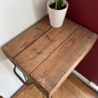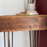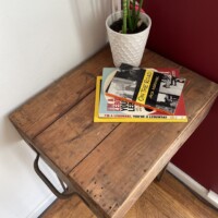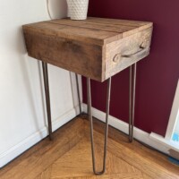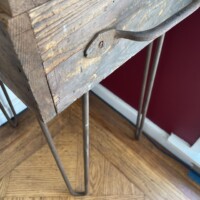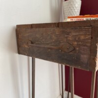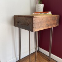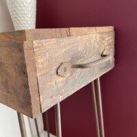 I made this side table from an old drawer that was used by a welder working in the shipyard here in San Francisco. Probably from the 50’s, the drawer has a rustic character, with a large steel drawer pull, and plenty of bumps and bruises from its previous life. There’s some writing on the side that says “Fleet” followed by something I can’t make out, and then “size 1/32”. Note that this is not a functional drawer, the drawer is the table.