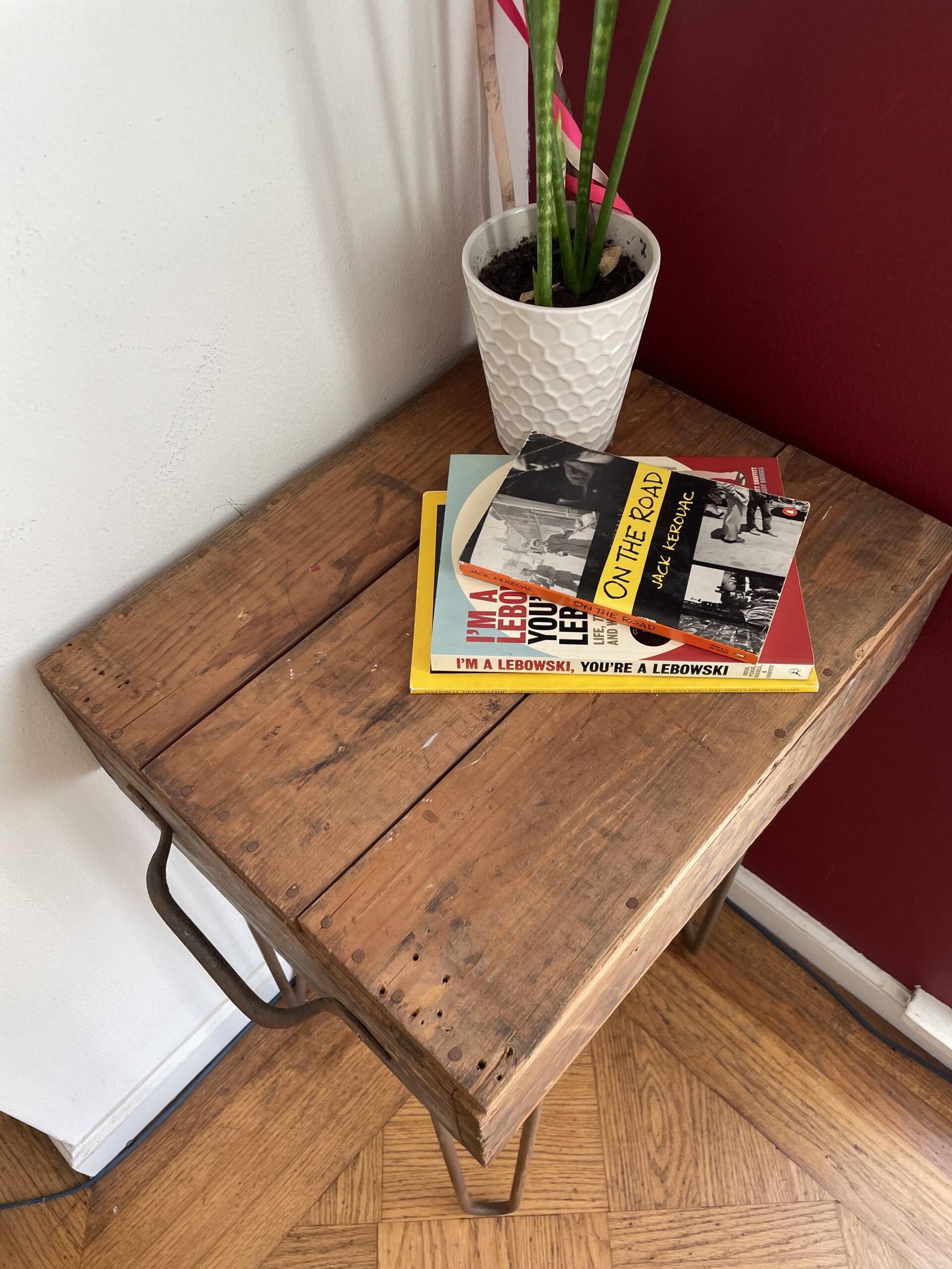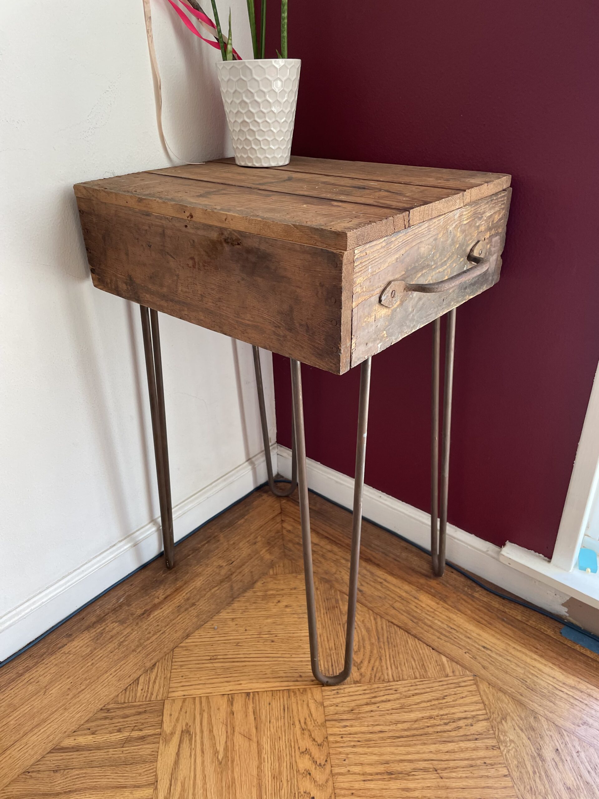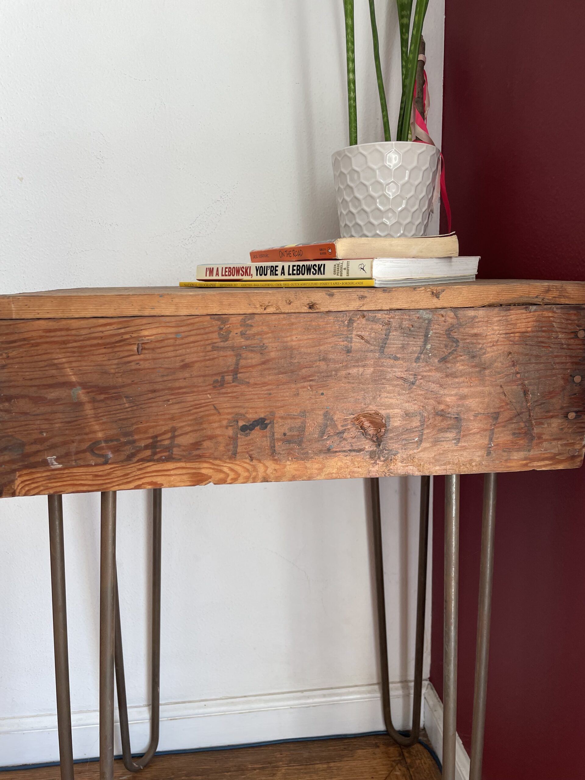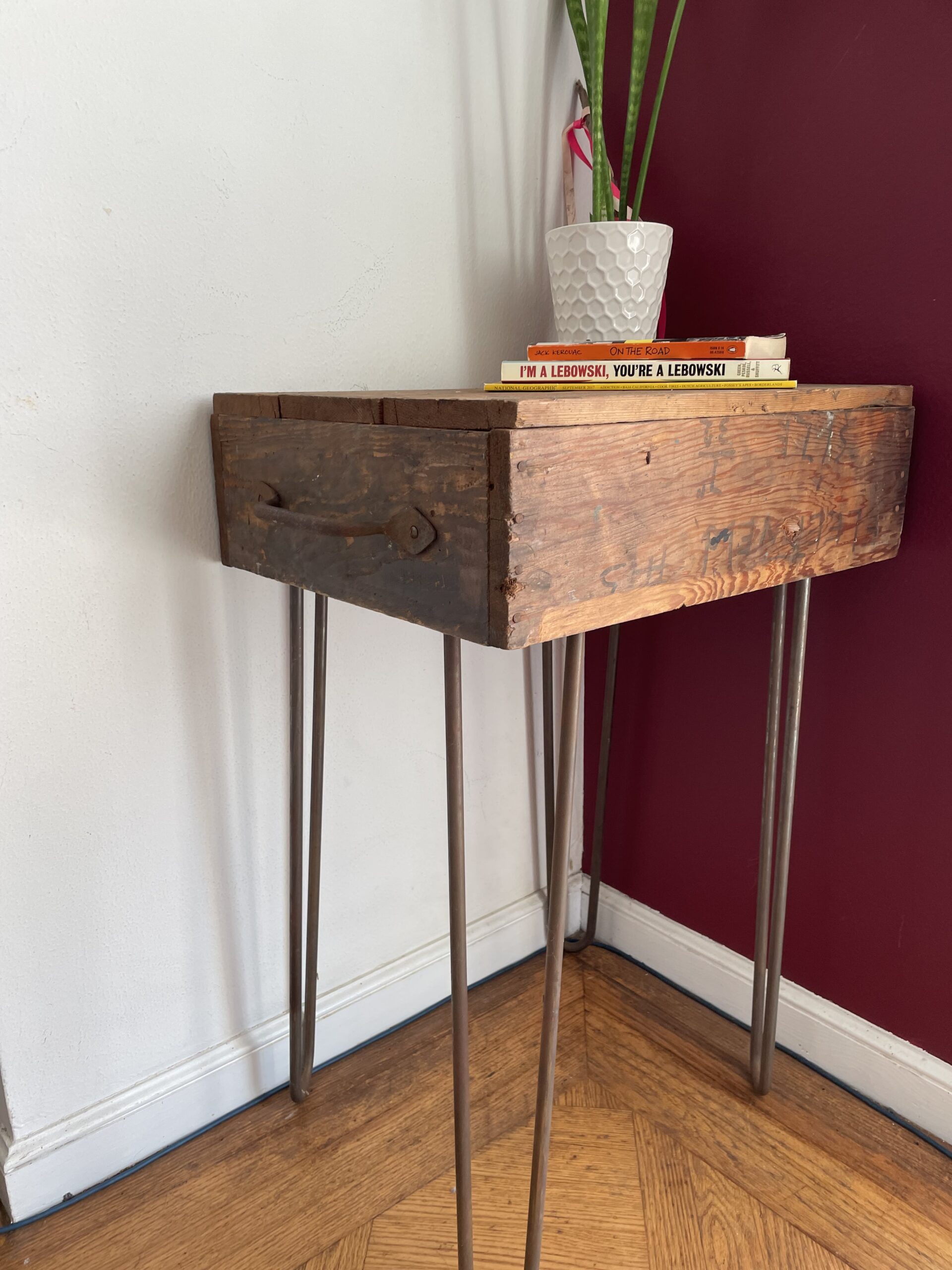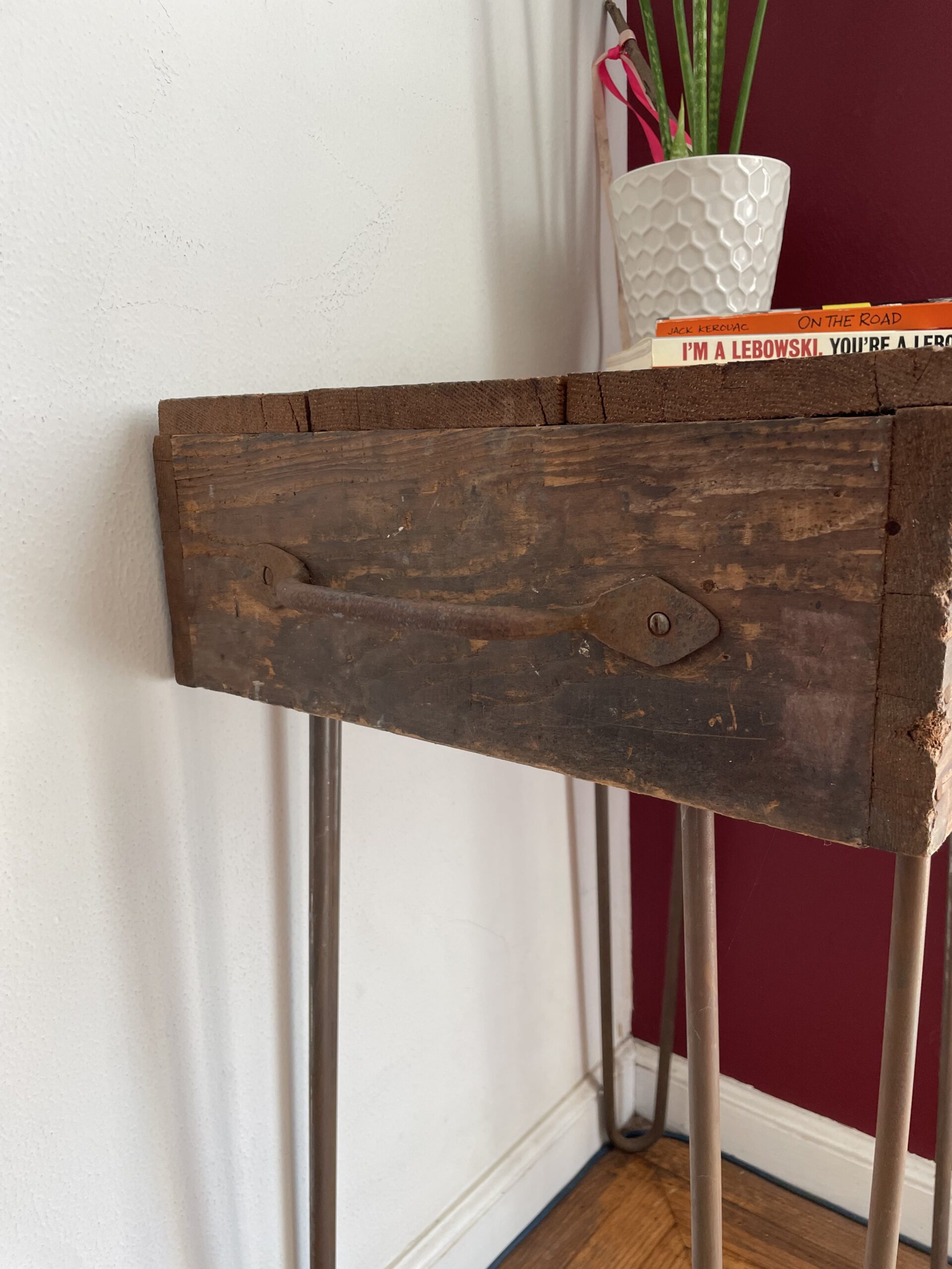 I made this side table from an old drawer that was used by a welder working in the shipyard here in San Francisco. Probably from the 50’s, the drawer has a rustic character, with a large steel drawer pull, and plenty of bumps and bruises from its previous life. There’s some writing on the side that says “Fleet” followed by something I can’t make out, and then “size 1/32”. Note that this is not a functional drawer, the drawer is the table.