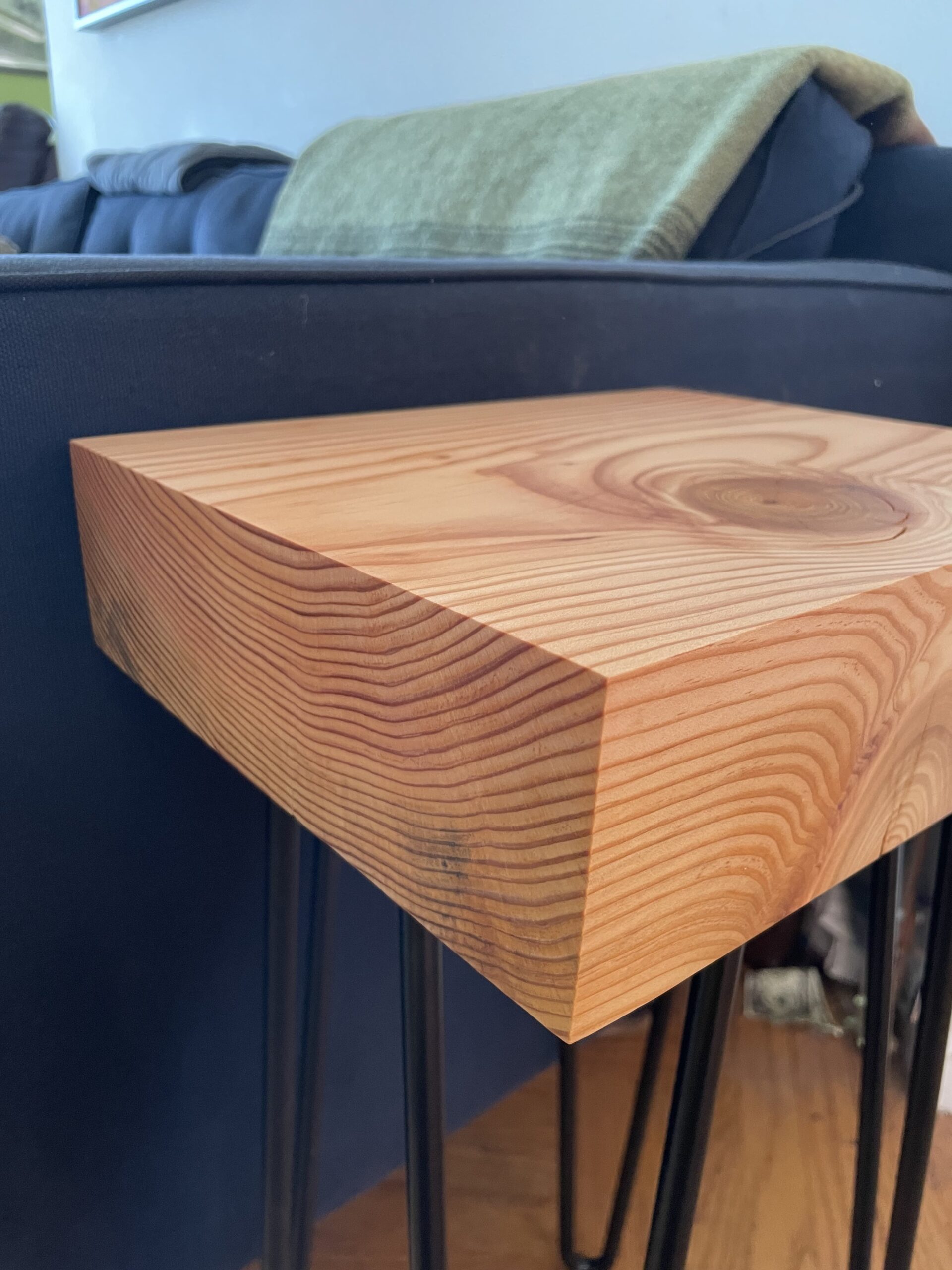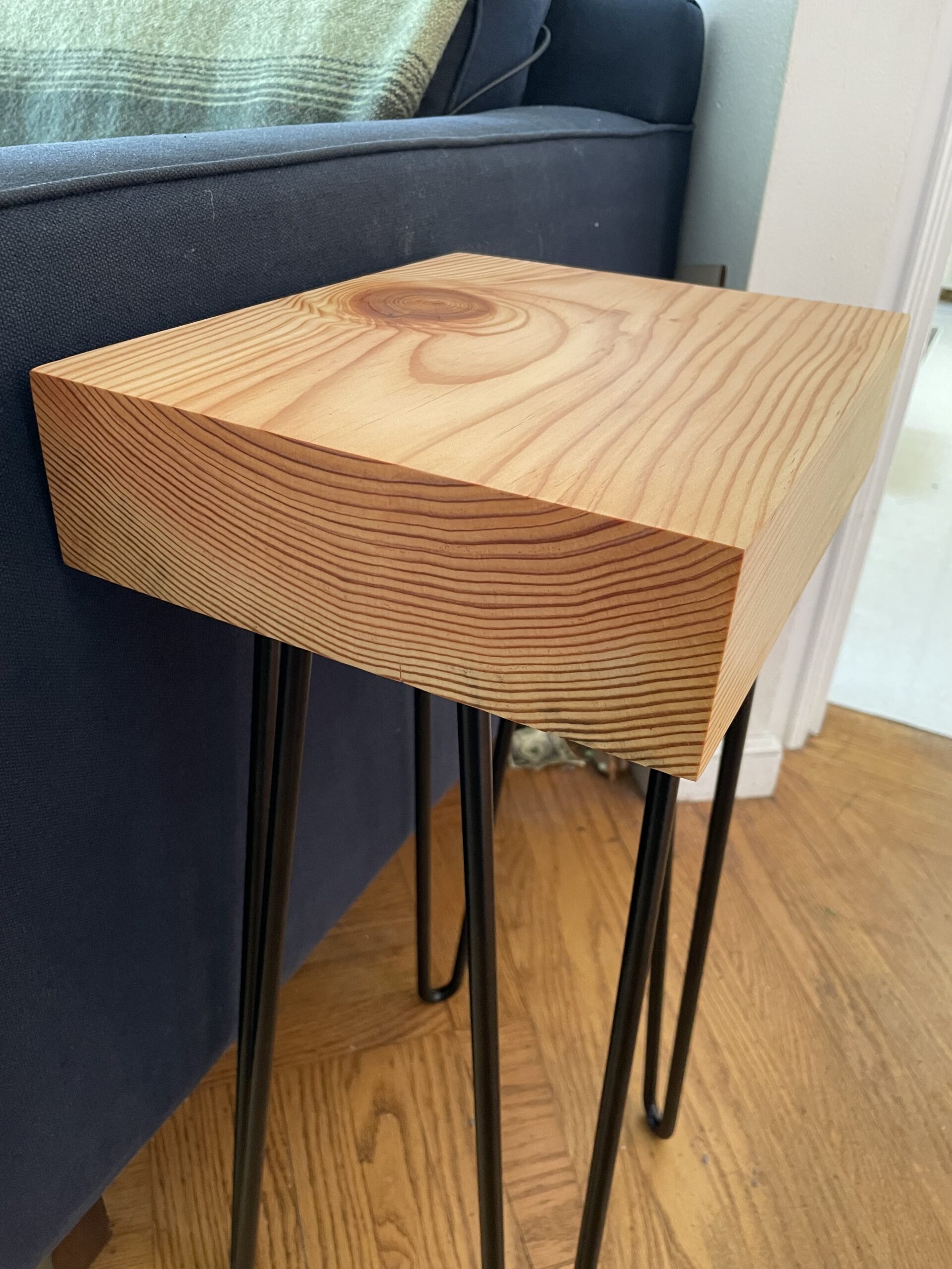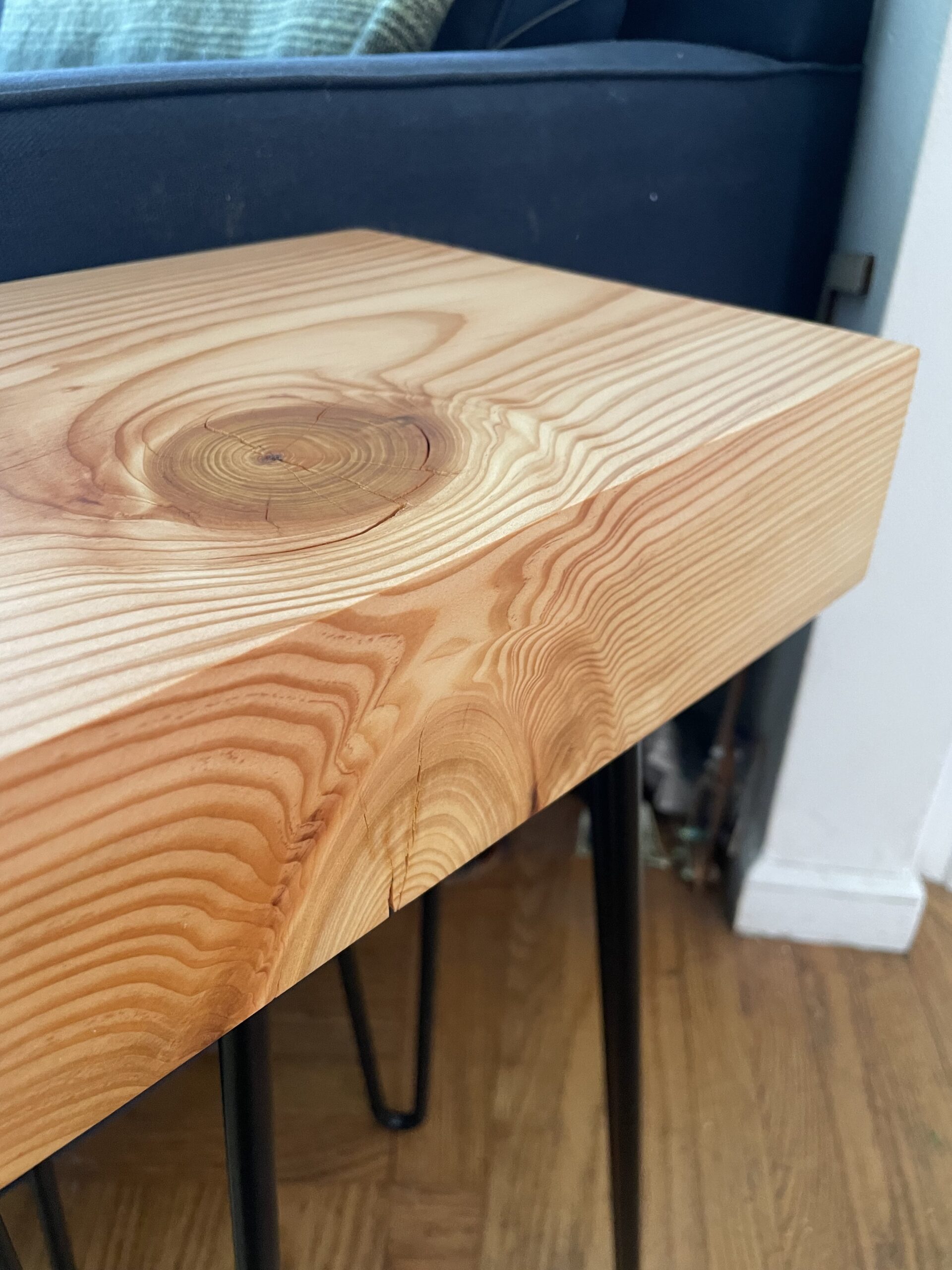 This table was made with a piece of reclaimed douglas fir. It has some interesting details in the wood, and is on steel hairpin legs. If you’d like to purchase this table, or have any questions, please contact me by clicking below.